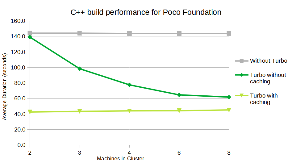 - Build times with caching (and 100% hit ratio) remained constant regardless of cluster size because all jobs were scheduled to the local Agent. In a more realistic environment, other Agents may have the cache result and will be scheduled. This would give marginally slower build-time due to the transfer of the object file across the network